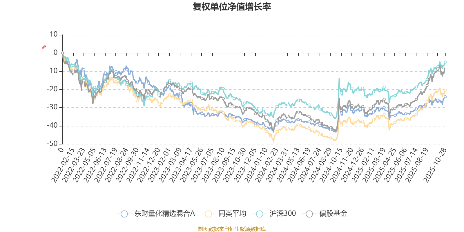 截至10月28日,东财量化精选混合A近三个月复权单位净值增长率为7.05%,位于同类可比基金513/689;近半年复权单位净值增长率为15.87%,位于同类可比基金552/688;近一年复权单位净值增长率为10.44%,位于同类可比基金564/653;近三年复权单位净值增长率为-6.95%,位于同类可比基金298/364。
