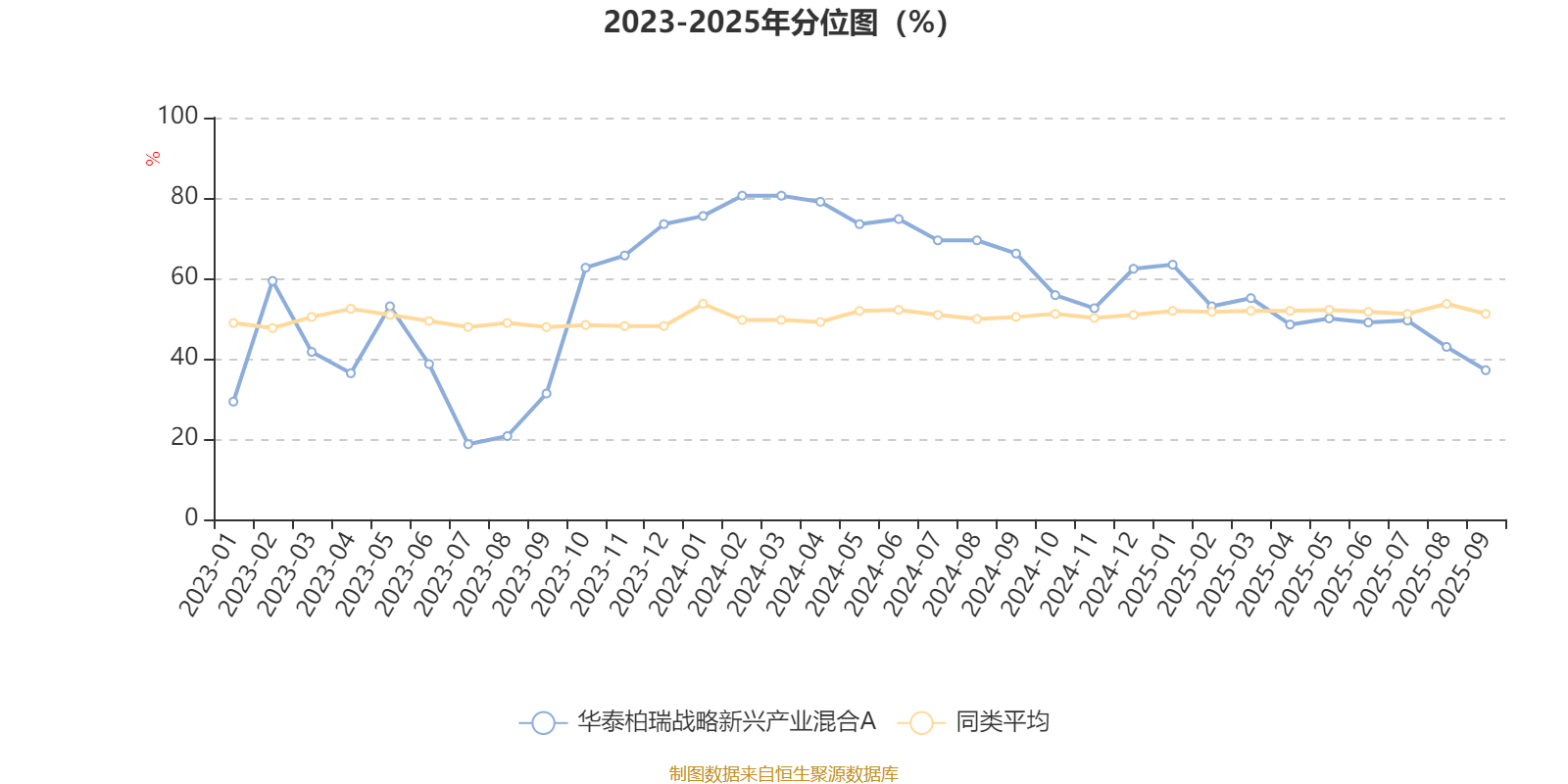 通过所选区间该基金净值增长率分位图,可以观察该基金与同类基金业绩比较情况。图为坐标原点到区间内某时点的净值增长率在同类基金中的分位数。