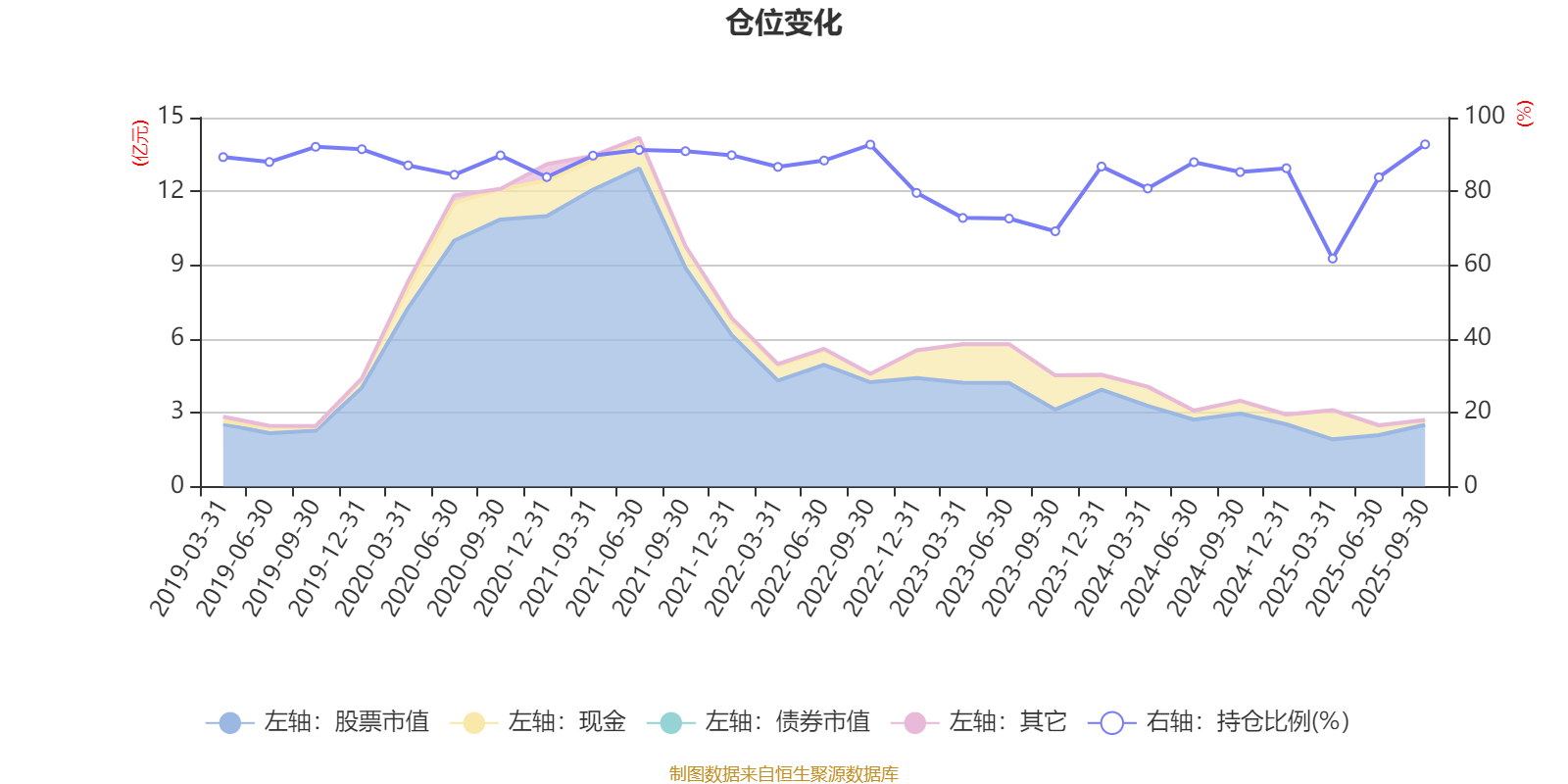 据定期报告数据统计,近三年平均股票仓位为79.96%,同类平均为86.94%。2025年三季度末基金达到92.75%的最高仓位,2025年一季度末最低,为61.8%。