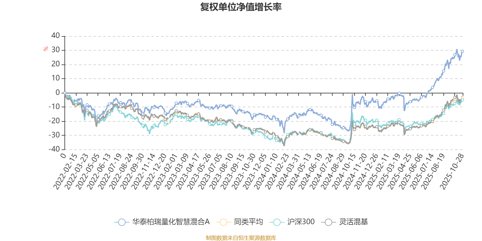 截至10月28日,华泰柏瑞量化智慧混合A近三个月复权单位净值增长率为18.49%,位于同类可比基金402/1287;近半年复权单位净值增长率为38.67%,位于同类可比基金303/1287;近一年复权单位净值增长率为37.66%,位于同类可比基金274/1287;近三年复权单位净值增长率为50.95%,位于同类可比基金147/1286。
