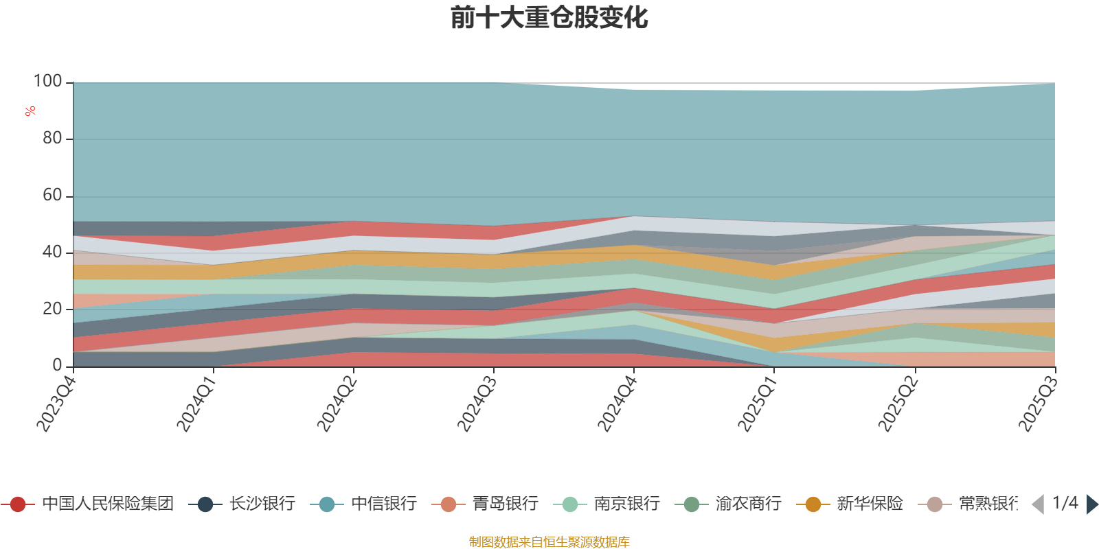 截至2025年三季度末,基金十大重仓股分别是新华保险、滨江集团、中国人寿、青岛银行、齐鲁银行、渝农商行、杭州银行、常熟银行、成都银行、江苏银行。
