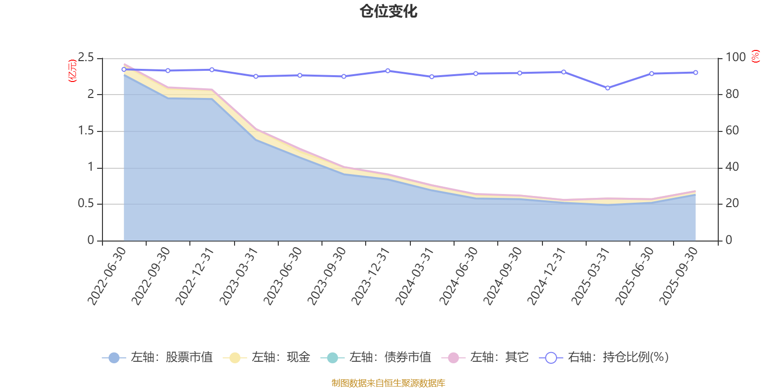 据定期报告数据统计,近三年平均股票仓位为90.89%,同类平均为83.73%。2022年上半年末基金达到93.87%的最高仓位,2025年一季度末最低,为83.69%。