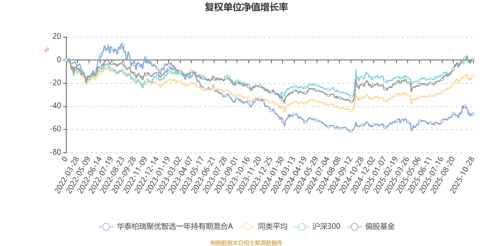 截至10月28日,华泰柏瑞聚优智选一年持有期混合A近三个月复权单位净值增长率为8.95%,位于同类可比基金459/689;近半年复权单位净值增长率为21.88%,位于同类可比基金446/688;近一年复权单位净值增长率为22.22%,位于同类可比基金378/653;近三年复权单位净值增长率为-42.02%,位于同类可比基金362/364。