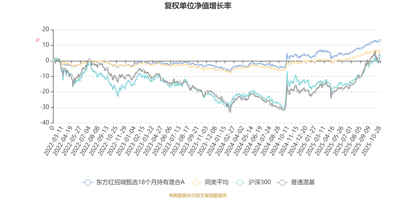 截至10月28日,东方红招瑞甄选18个月持有混合A近三个月复权单位净值增长率为4.63%,位于同类可比基金117/629;近半年复权单位净值增长率为9.71%,位于同类可比基金102/629;近一年复权单位净值增长率为9.75%,位于同类可比基金148/623;近三年复权单位净值增长率为18.09%,位于同类可比基金114/557。