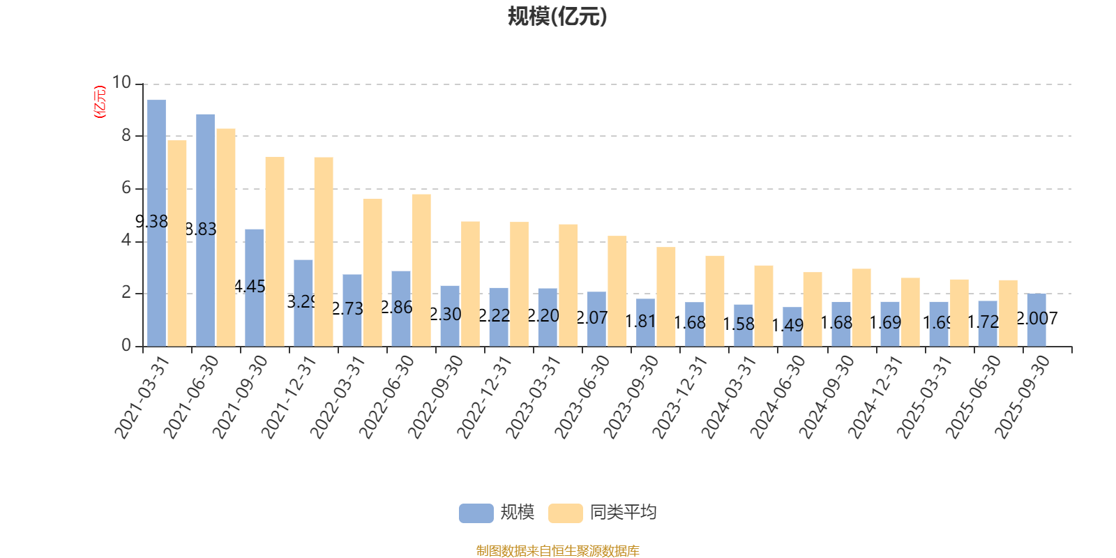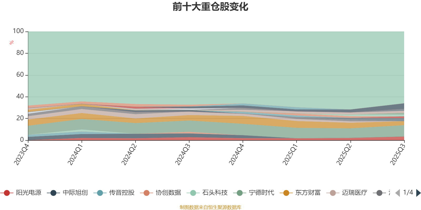 截至2025年三季度末,基金十大重仓股分别是宁德时代、新易盛、东方财富、阳光电源、寒武纪、亿纬锂能、胜宏科技、海光信息、药明康德、新强联。