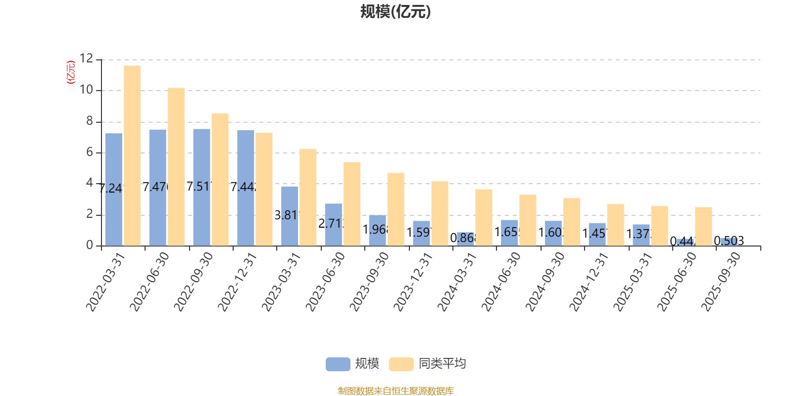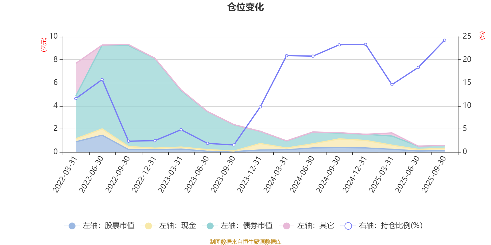 据定期报告数据统计,近三年平均股票仓位为13.84%,同类平均为19.14%。2025年三季度末基金达到24.26%的最高仓位,2023年三季度末最低,为1.54%。