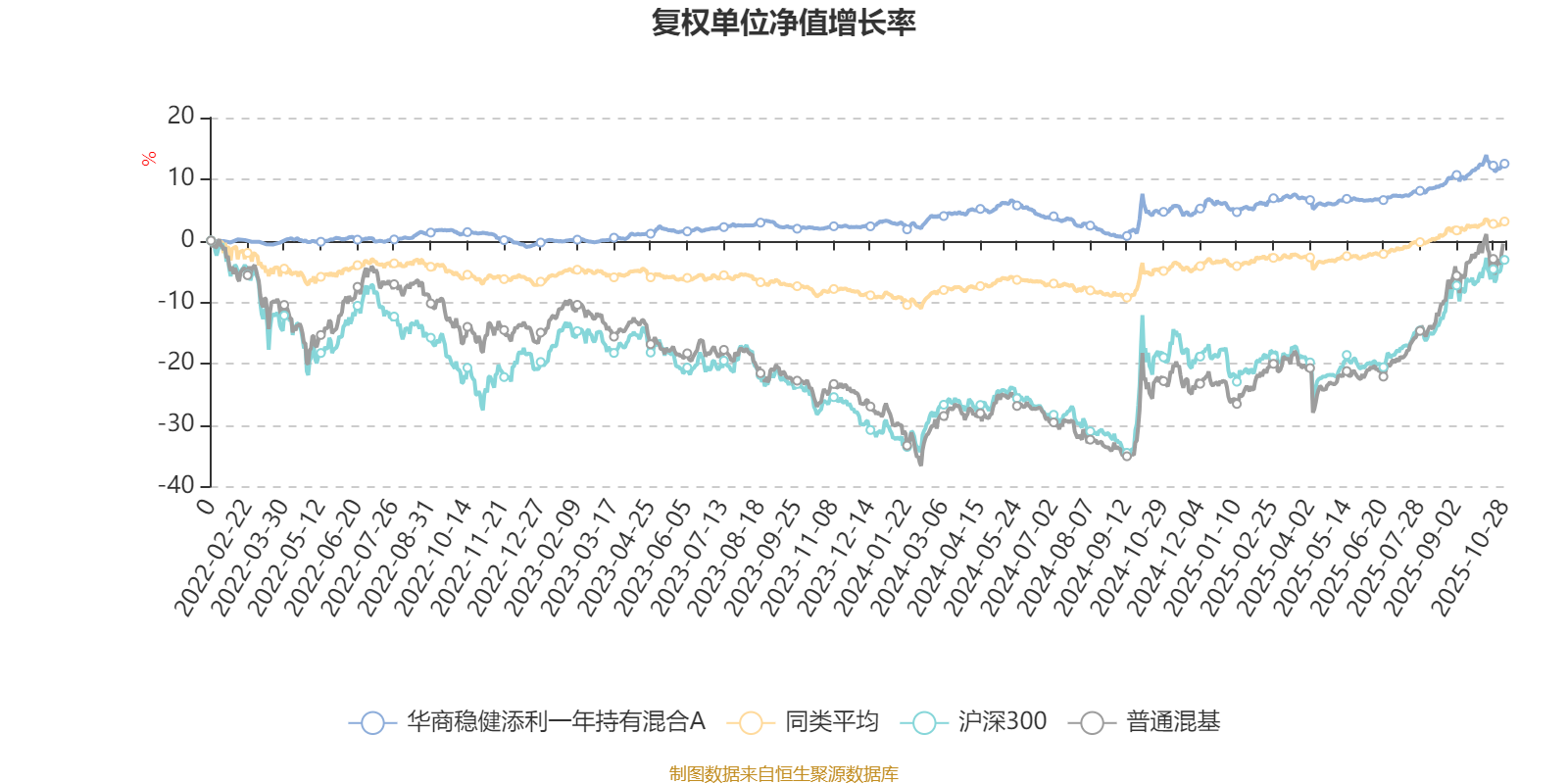 截至10月28日,华商稳健添利一年持有混合A近三个月复权单位净值增长率为4.08%,位于同类可比基金153/629;近半年复权单位净值增长率为6.25%,位于同类可比基金251/629;近一年复权单位净值增长率为7.19%,位于同类可比基金283/623;近三年复权单位净值增长率为11.16%,位于同类可比基金302/557。