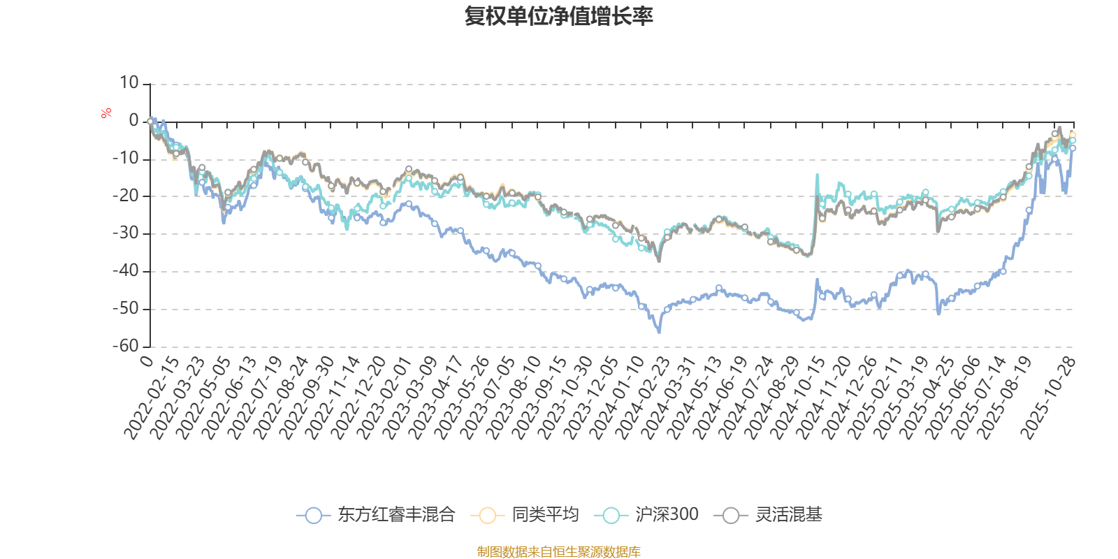 截至10月28日,东方红睿丰混合近三个月复权单位净值增长率为43.13%,位于同类可比基金65/1287;近半年复权单位净值增长率为77.55%,位于同类可比基金50/1287;近一年复权单位净值增长率为70.78%,位于同类可比基金63/1287;近三年复权单位净值增长率为29.00%,位于同类可比基金386/1286。
