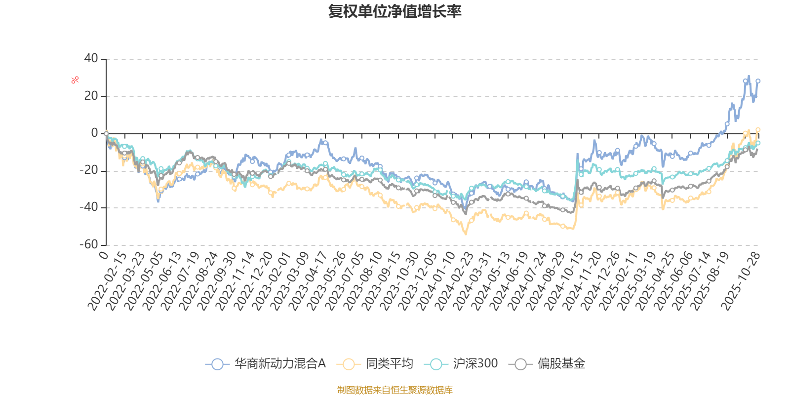 截至10月28日,华商新动力混合A近三个月复权单位净值增长率为31.20%,位于同类可比基金145/229;近半年复权单位净值增长率为45.70%,位于同类可比基金137/229;近一年复权单位净值增长率为49.87%,位于同类可比基金123/213;近三年复权单位净值增长率为50.63%,位于同类可比基金74/158。