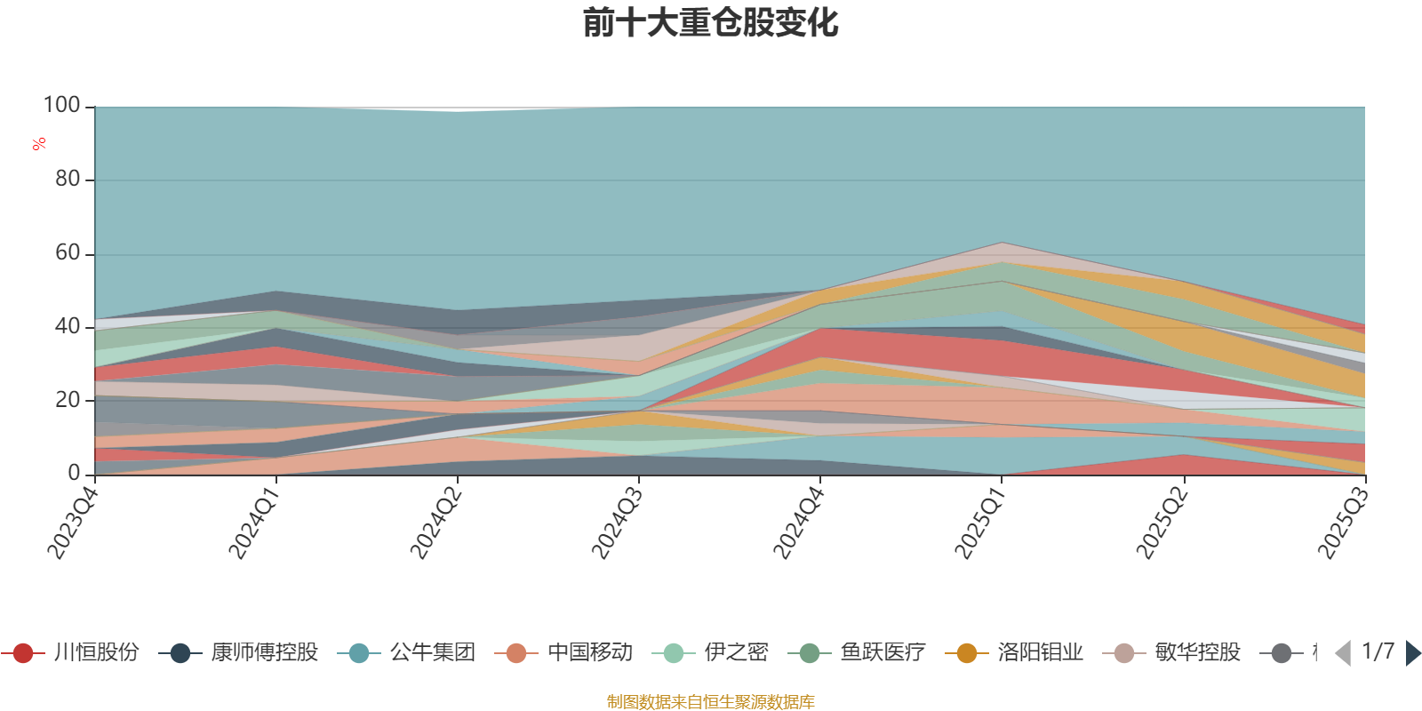 截至2025年三季度末,基金十大重仓股分别是伊利股份、新宙邦、三一重工、腾讯控股、百胜中国、洛阳钼业、中国人寿、牧原股份、东岳集团、兆易创新。