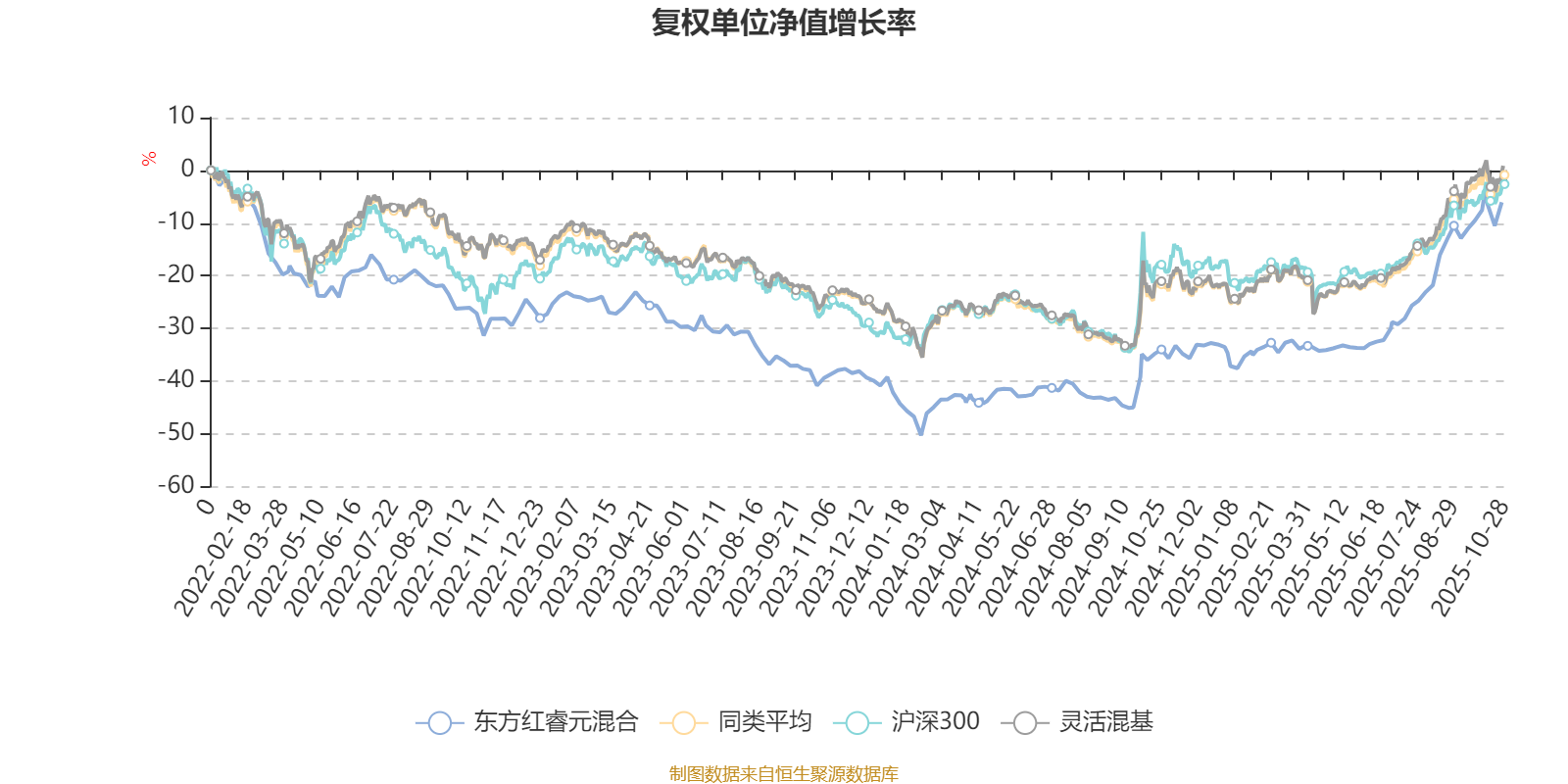 截至10月24日,东方红睿元混合近三个月复权单位净值增长率为26.41%,位于同类可比基金220/1287;近半年复权单位净值增长率为42.59%,位于同类可比基金229/1287;近一年复权单位净值增长率为44.16%,位于同类可比基金205/1287;近三年复权单位净值增长率为28.91%,位于同类可比基金388/1286。