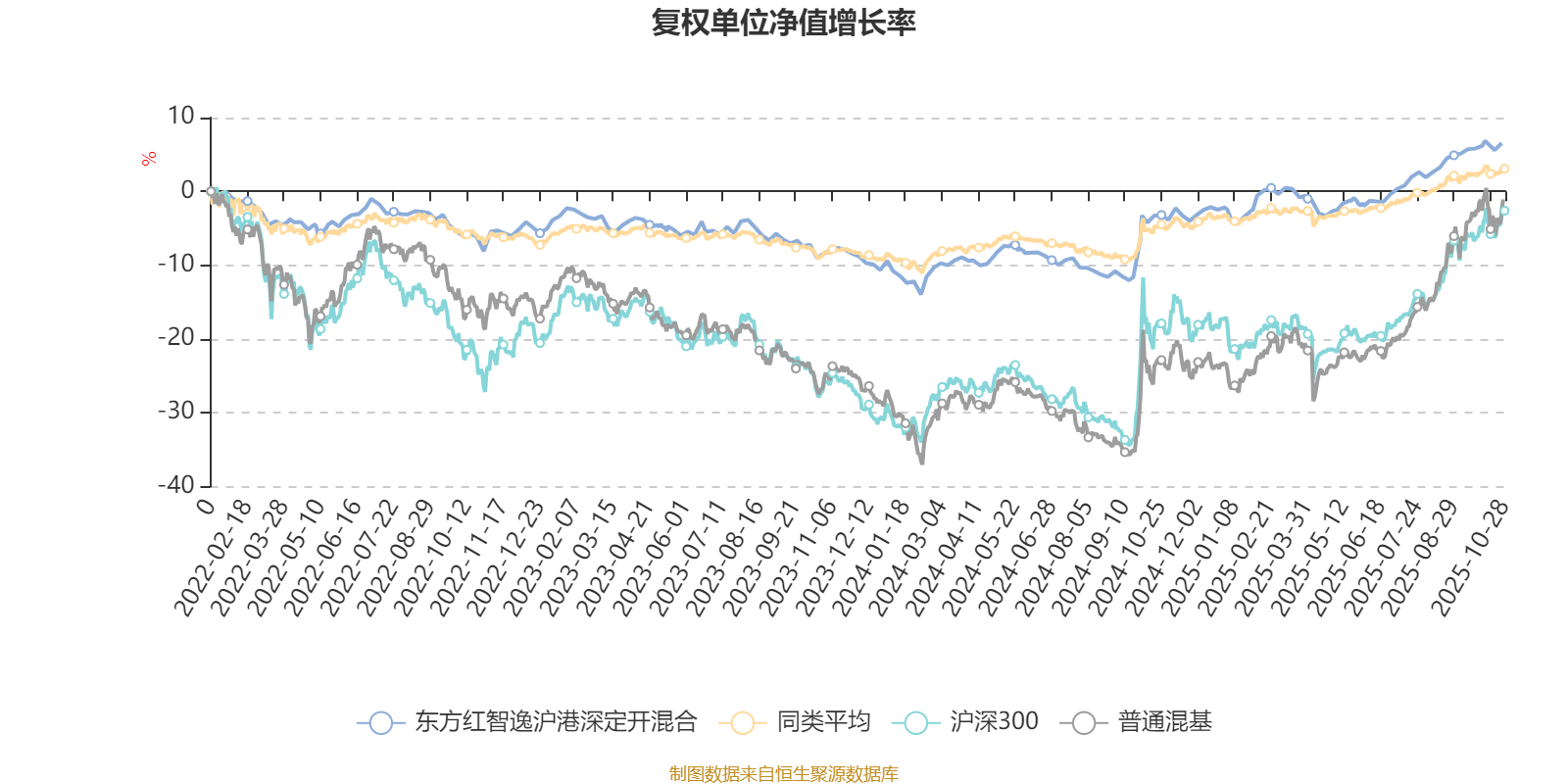 截至10月24日,东方红智逸沪港深定开混合近三个月复权单位净值增长率为4.46%,位于同类可比基金124/629;近半年复权单位净值增长率为10.17%,位于同类可比基金90/629;近一年复权单位净值增长率为10.14%,位于同类可比基金135/623;近三年复权单位净值增长率为13.54%,位于同类可比基金225/557。