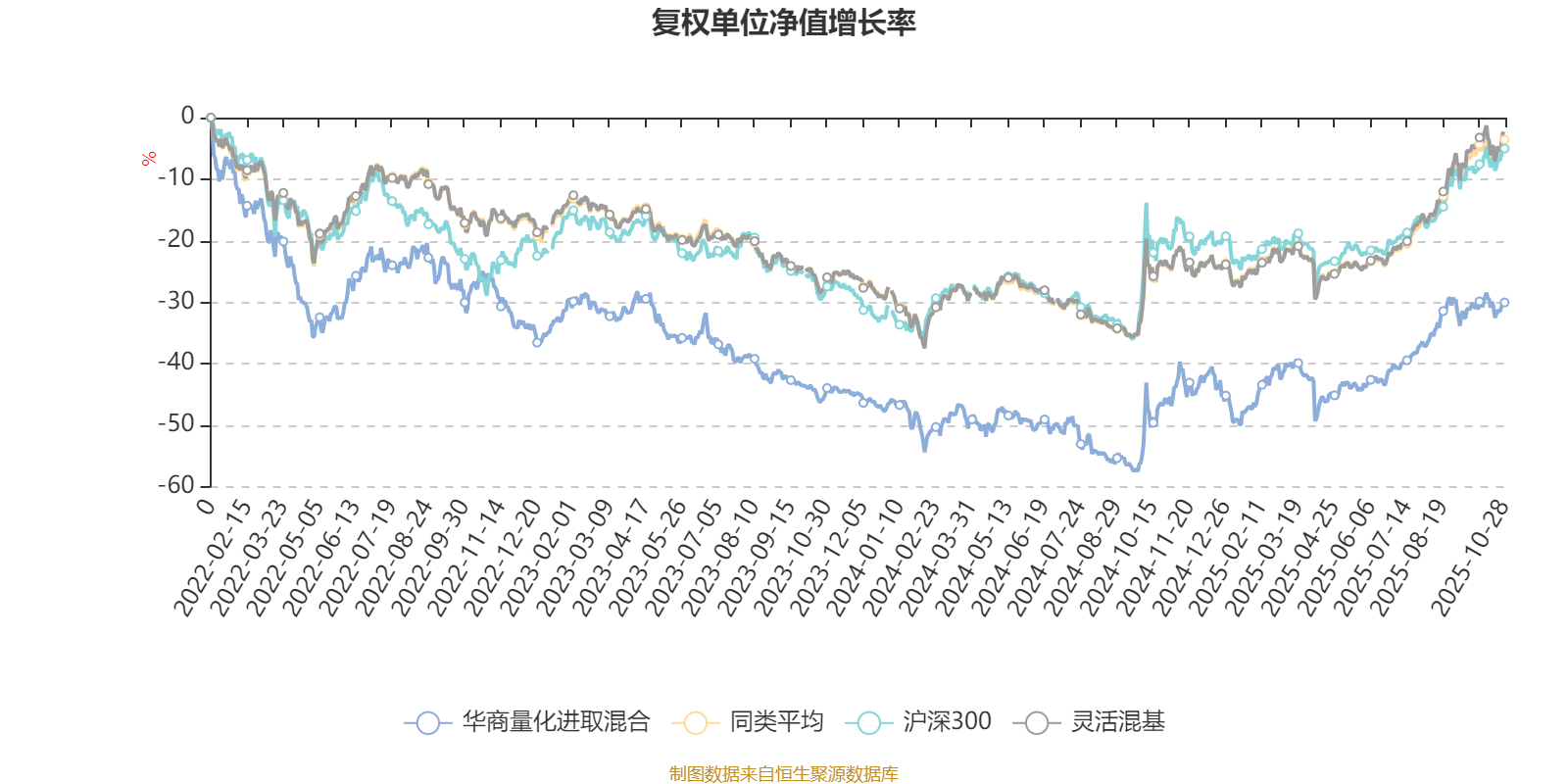 截至10月28日,华商量化进取混合近三个月复权单位净值增长率为10.89%,位于同类可比基金673/1287;近半年复权单位净值增长率为28.62%,位于同类可比基金519/1287;近一年复权单位净值增长率为28.76%,位于同类可比基金451/1287;近三年复权单位净值增长率为-4.18%,位于同类可比基金1082/1286。