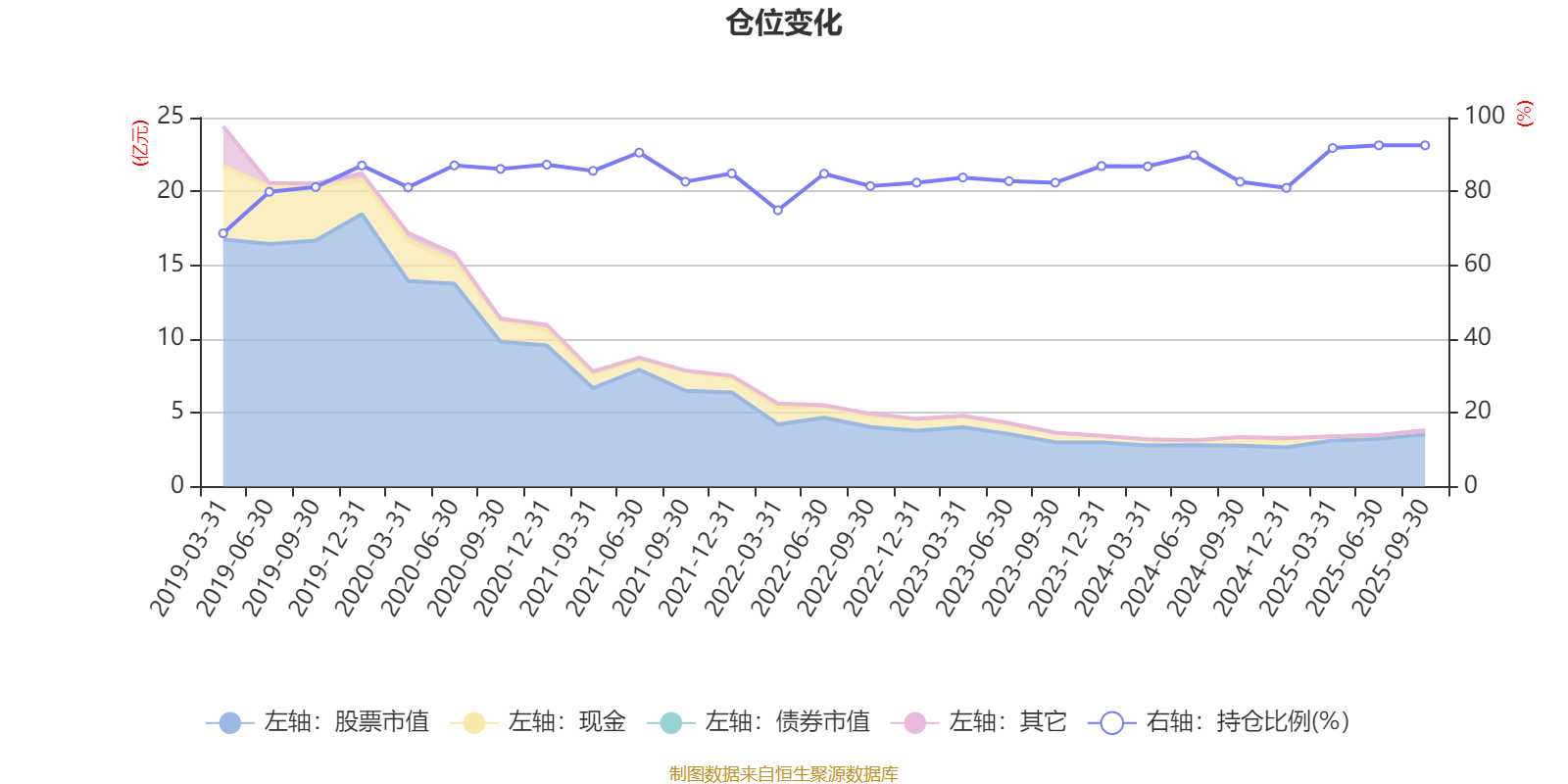 据定期报告数据统计,近三年平均股票仓位为86.25%,同类平均为72.35%。2025年上半年末基金达到92.49%的最高仓位,2019年一季度末最低,为68.63%。