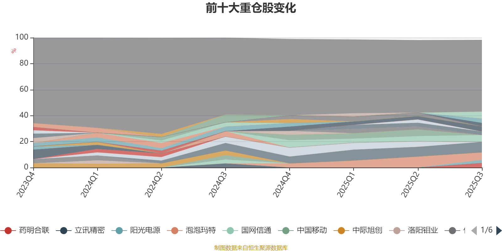 截至2025年三季度末,基金十大重仓股分别是腾讯控股、泡泡玛特、新易盛、宁德时代、药明康德、药明合联、工业富联、中国财险、阿里巴巴-W、阳光电源。