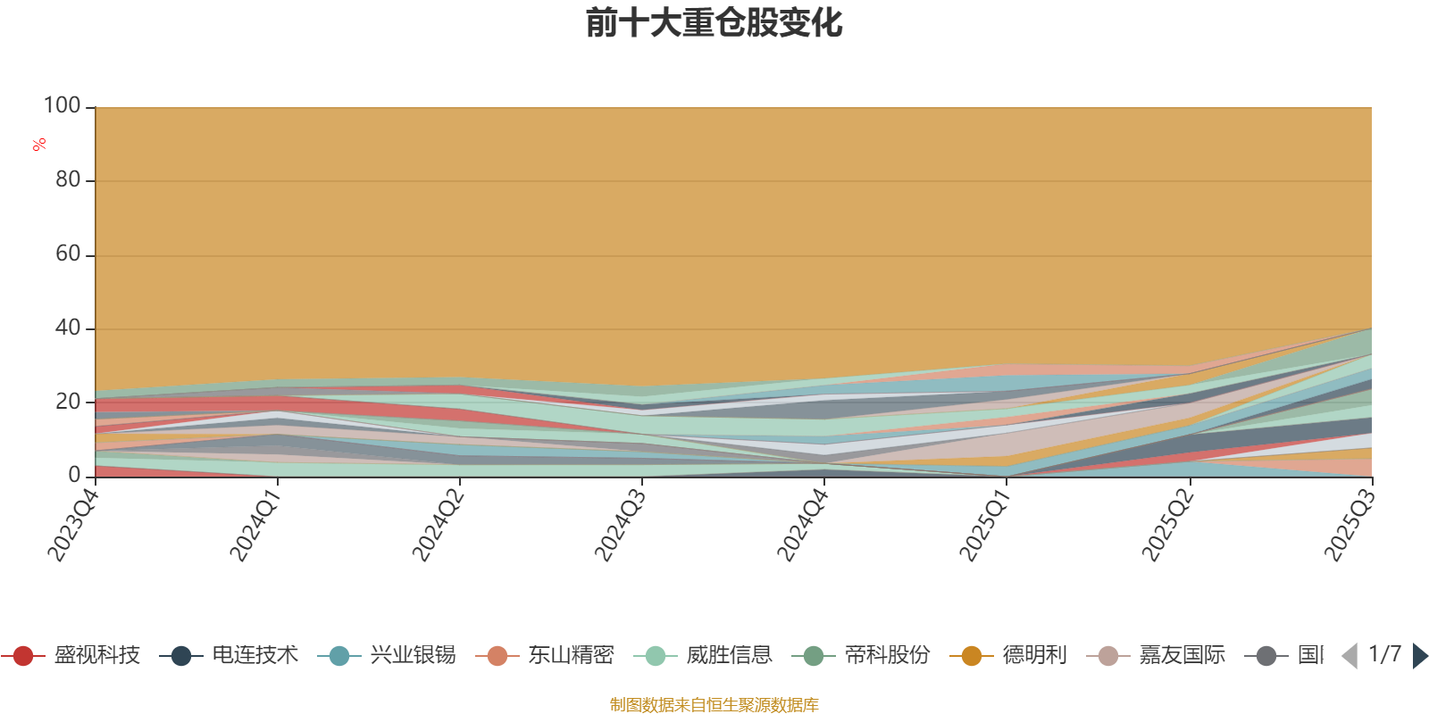 截至2025年三季度末,基金十大重仓股分别是亿纬锂能、东山精密、盛达资源、中航沈飞、信立泰、恒玄科技、宁德时代、德明利、澜起科技、寒武纪。