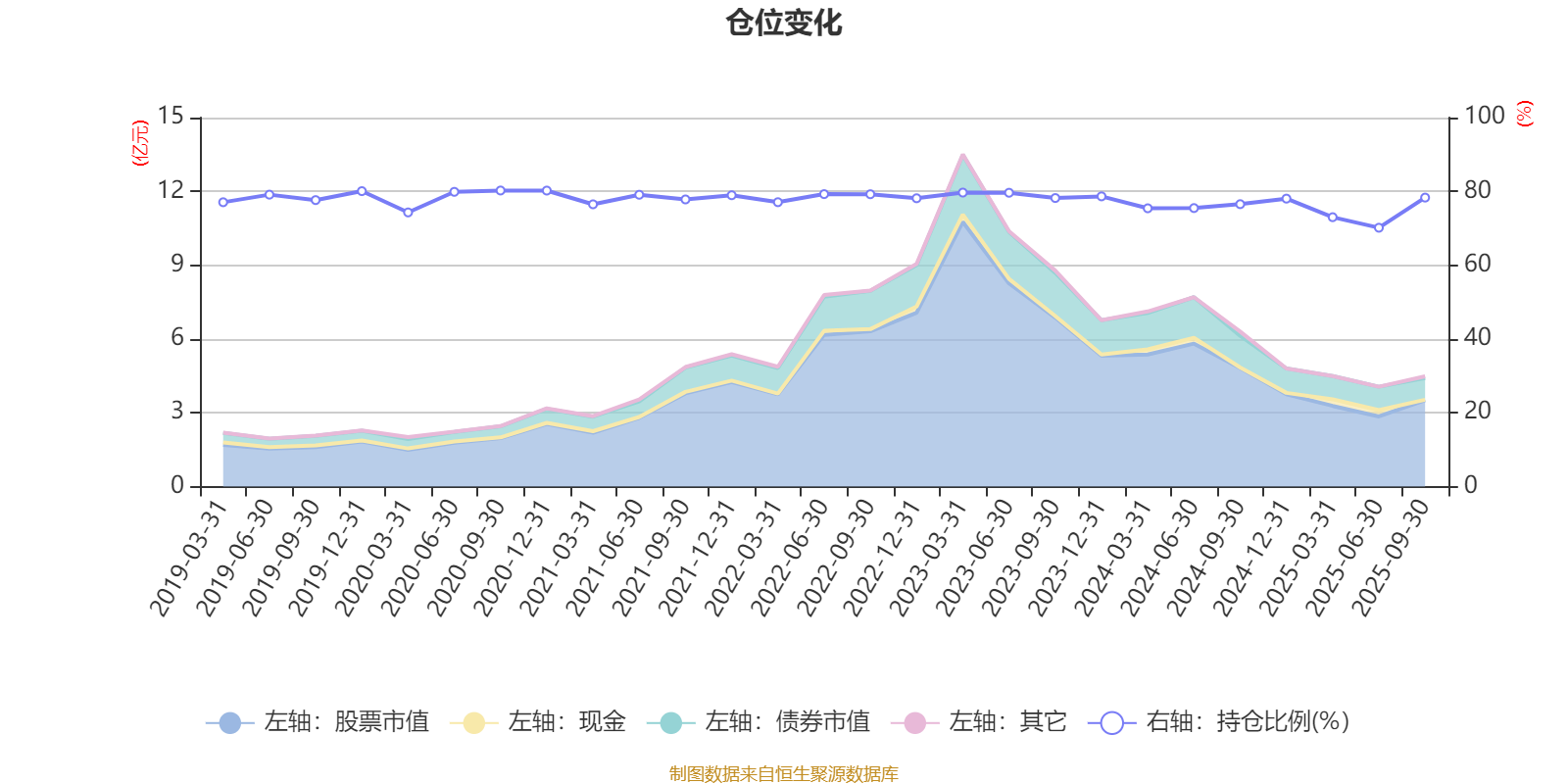 据定期报告数据统计,近三年平均股票仓位为76.77%,同类平均为72.35%。2020年三季度末基金达到80.24%的最高仓位,2025年上半年末最低,为70.15%。