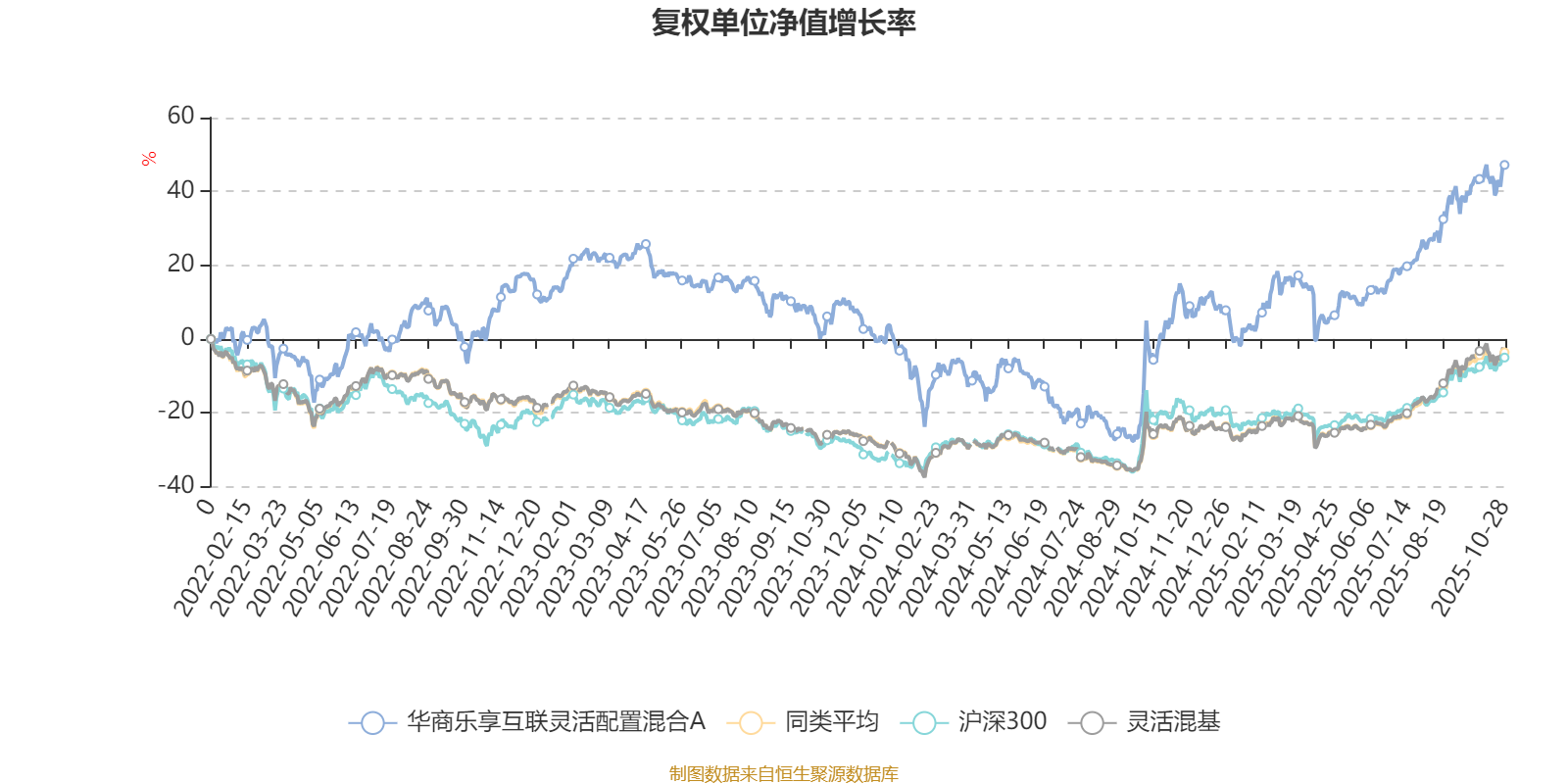 截至10月28日,华商乐享互联灵活配置混合A近三个月复权单位净值增长率为17.91%,位于同类可比基金414/1287;近半年复权单位净值增长率为39.28%,位于同类可比基金289/1287;近一年复权单位净值增长率为40.15%,位于同类可比基金245/1287;近三年复权单位净值增长率为47.92%,位于同类可比基金164/1286。