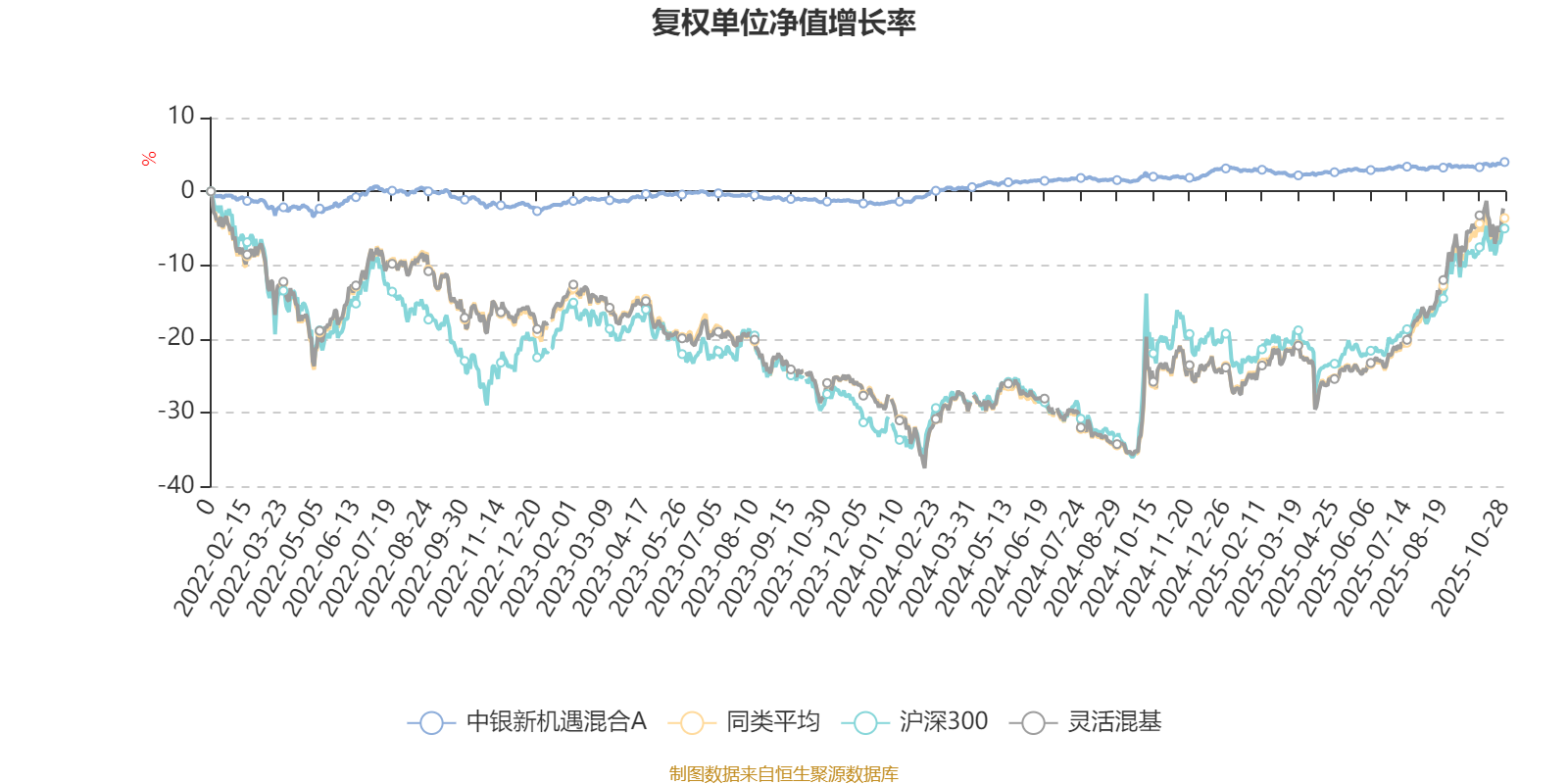 截至10月28日,中银新机遇混合A近三个月复权单位净值增长率为0.80%,位于同类可比基金1168/1287;近半年复权单位净值增长率为1.30%,位于同类可比基金1262/1287;近一年复权单位净值增长率为2.05%,位于同类可比基金1212/1287;近三年复权单位净值增长率为6.17%,位于同类可比基金888/1286。