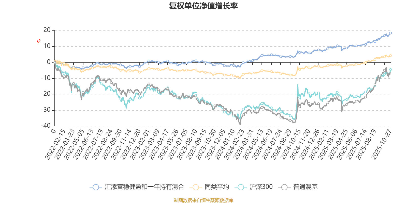 截至10月27日,汇添富稳健盈和一年持有混合近三个月复权单位净值增长率为5.24%,位于同类可比基金102/629;近半年复权单位净值增长率为8.68%,位于同类可比基金135/629;近一年复权单位净值增长率为11.68%,位于同类可比基金98/623;近三年复权单位净值增长率为22.55%,位于同类可比基金53/557。