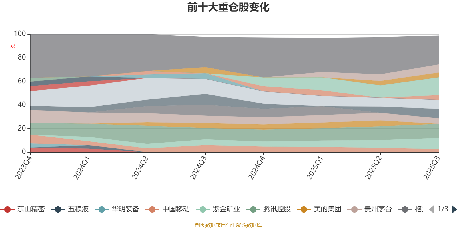 该基金持股集中度较高,近2年前十大重仓股集中度长期超过60%。截至2025年三季度末,基金十大重仓股分别是阿里巴巴-W、腾讯控股、紫金矿业、宁德时代、中国海洋石油、中国宏桥、贵州茅台、川投能源、思源电气、中国移动。