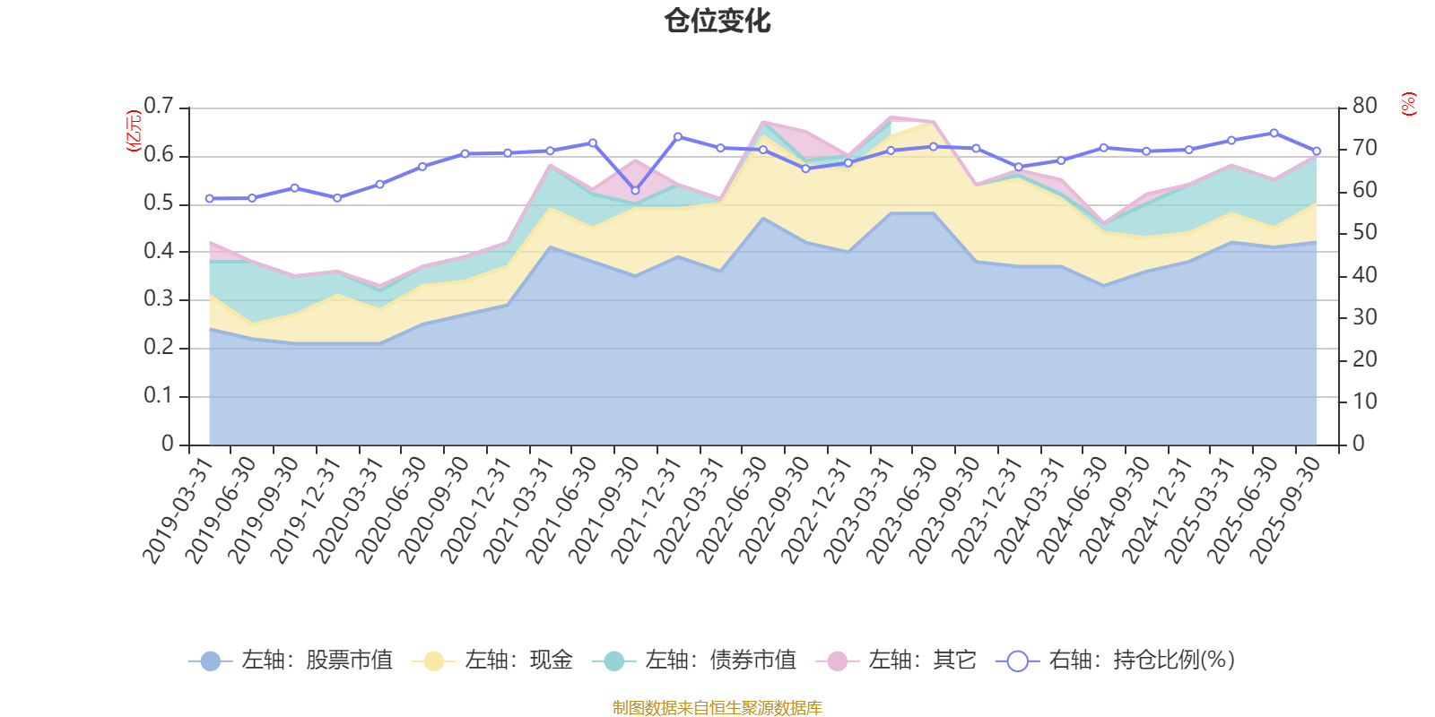 据定期报告数据统计,近三年平均股票仓位为69.76%,同类平均为72.35%。2025年上半年末基金达到73.97%的最高仓位,2019年一季度末最低,为58.43%。