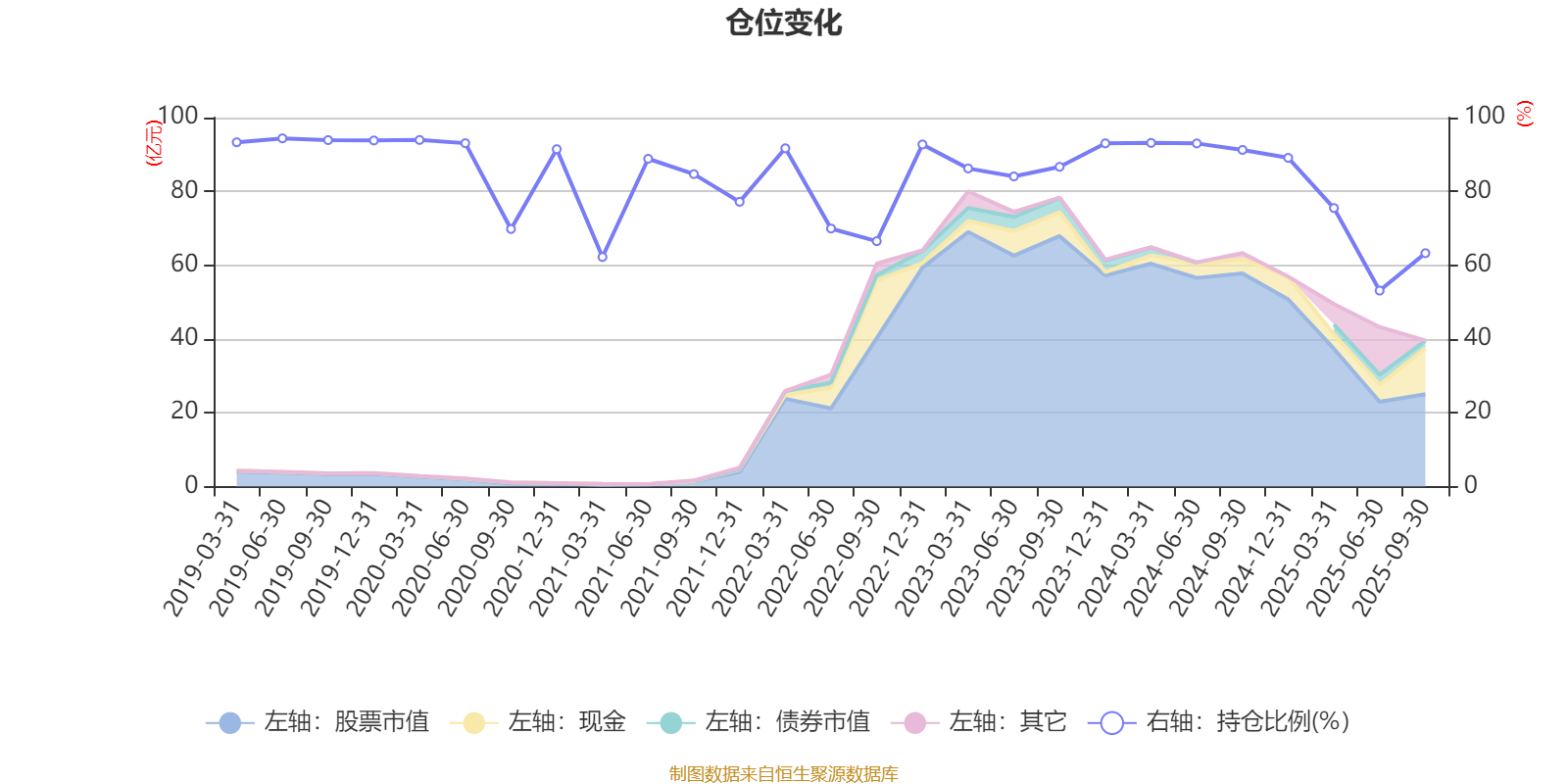 据定期报告数据统计,近三年平均股票仓位为83.42%,同类平均为72.35%。2019年上半年末基金达到94.37%的最高仓位,2025年上半年末最低,为53.11%。