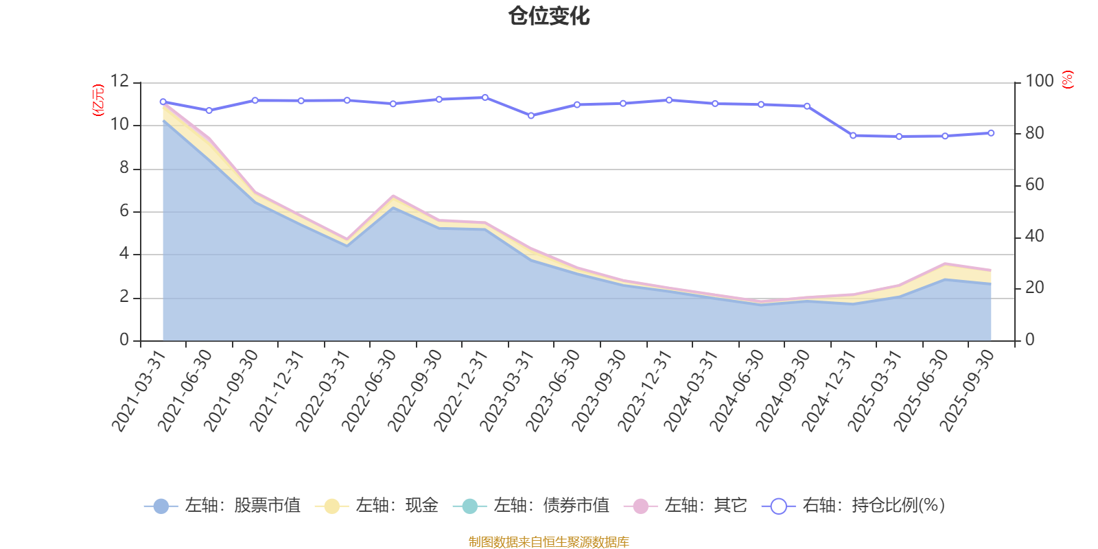 据定期报告数据统计,近三年平均股票仓位为87.48%,同类平均为85.66%。2022年末基金达到94.16%的最高仓位,2025年一季度末最低,为79.05%。
