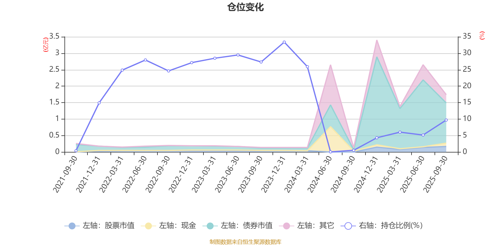 基金管理人在三季报中表示,产品操作上,三季度本基金股票维持中性仓位,港股占比小幅提升。配置仓以稳健分红类股票为主,主要分布于食品饮料、非银、通信等行业,交易仓主要选择基础化工、机械、有色、电子等行业,组合持仓结构更为均衡。债券资产部分,7 月在“反内卷”、中美关税、政治局会议预期扰动下,债市利率快速上行,8 月股债跷跷板压制下债市承压明显,9 月在公募基金新规征求意见、权益市场反弹、资金面边际收敛等因素的影响下,债市继续回调;本基金三季度主要配置中短端信用债,久期环比显著下降。