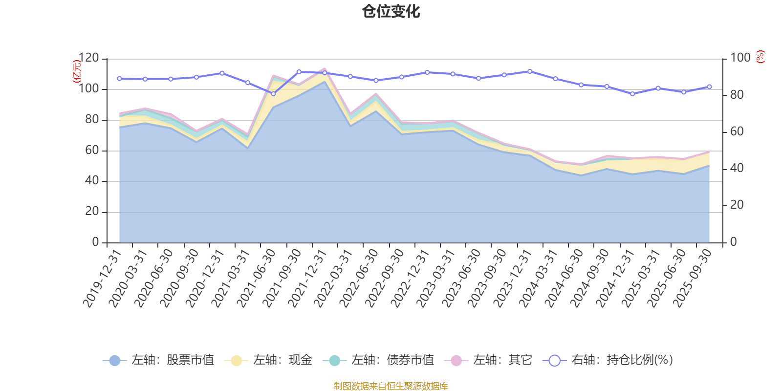 据定期报告数据统计,近三年平均股票仓位为87.41%,同类平均为86.15%。2023年末基金达到93.09%的最高仓位,2024年末最低,为80.87%。