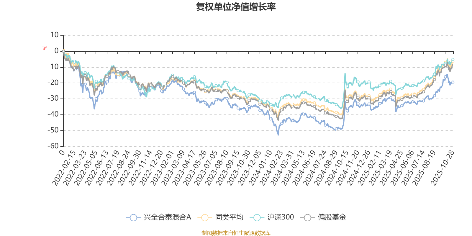 截至10月28日,兴全合泰混合A近三个月复权单位净值增长率为12.41%,位于同类可比基金78/130;近半年复权单位净值增长率为23.18%,位于同类可比基金80/130;近一年复权单位净值增长率为21.98%,位于同类可比基金79/130;近三年复权单位净值增长率为13.36%,位于同类可比基金89/124。