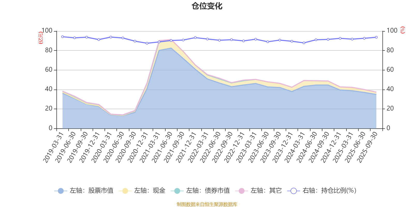 据定期报告数据统计,近三年平均股票仓位为90.96%,同类平均为89.52%。2019年一季度末基金达到94.19%的最高仓位,2020年末最低,为87.48%。