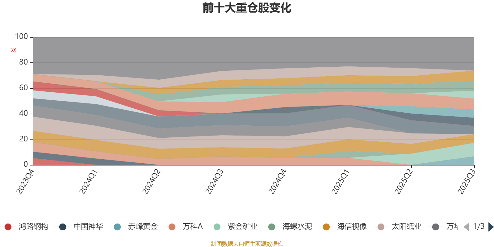 该基金持股集中度较高,近2年前十大重仓股集中度长期超过60%。截至2025年三季度末,基金十大重仓股分别是紫金矿业、成都银行、海丰国际、华鲁恒升、海信视像、赤峰黄金、亿联网络、招商银行、南钢股份、龙湖集团。