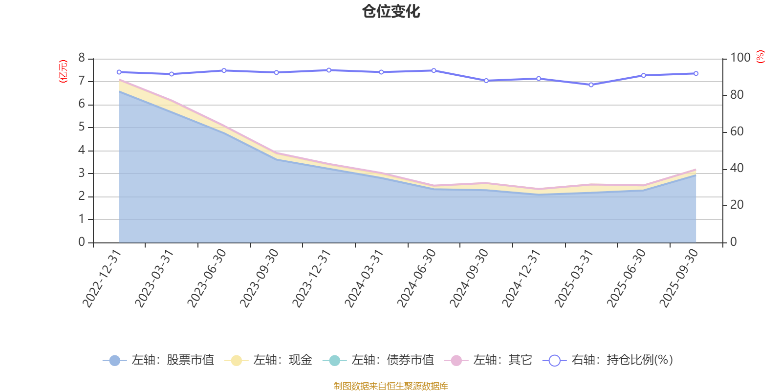 据定期报告数据统计,近三年平均股票仓位为91.36%,同类平均为85.66%。2023年末基金达到93.76%的最高仓位,2025年一季度末最低,为85.78%。