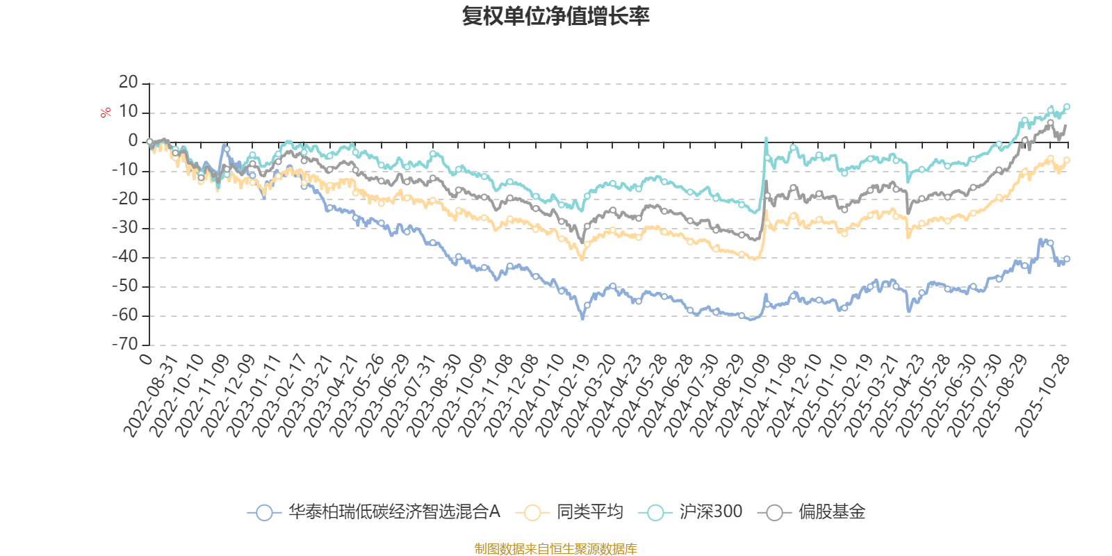 截至10月28日,华泰柏瑞低碳经济智选混合A近三个月复权单位净值增长率为11.19%,位于同类可比基金390/621;近半年复权单位净值增长率为25.43%,位于同类可比基金371/619;近一年复权单位净值增长率为34.38%,位于同类可比基金221/611;近三年复权单位净值增长率为-33.09%,位于同类可比基金515/518。