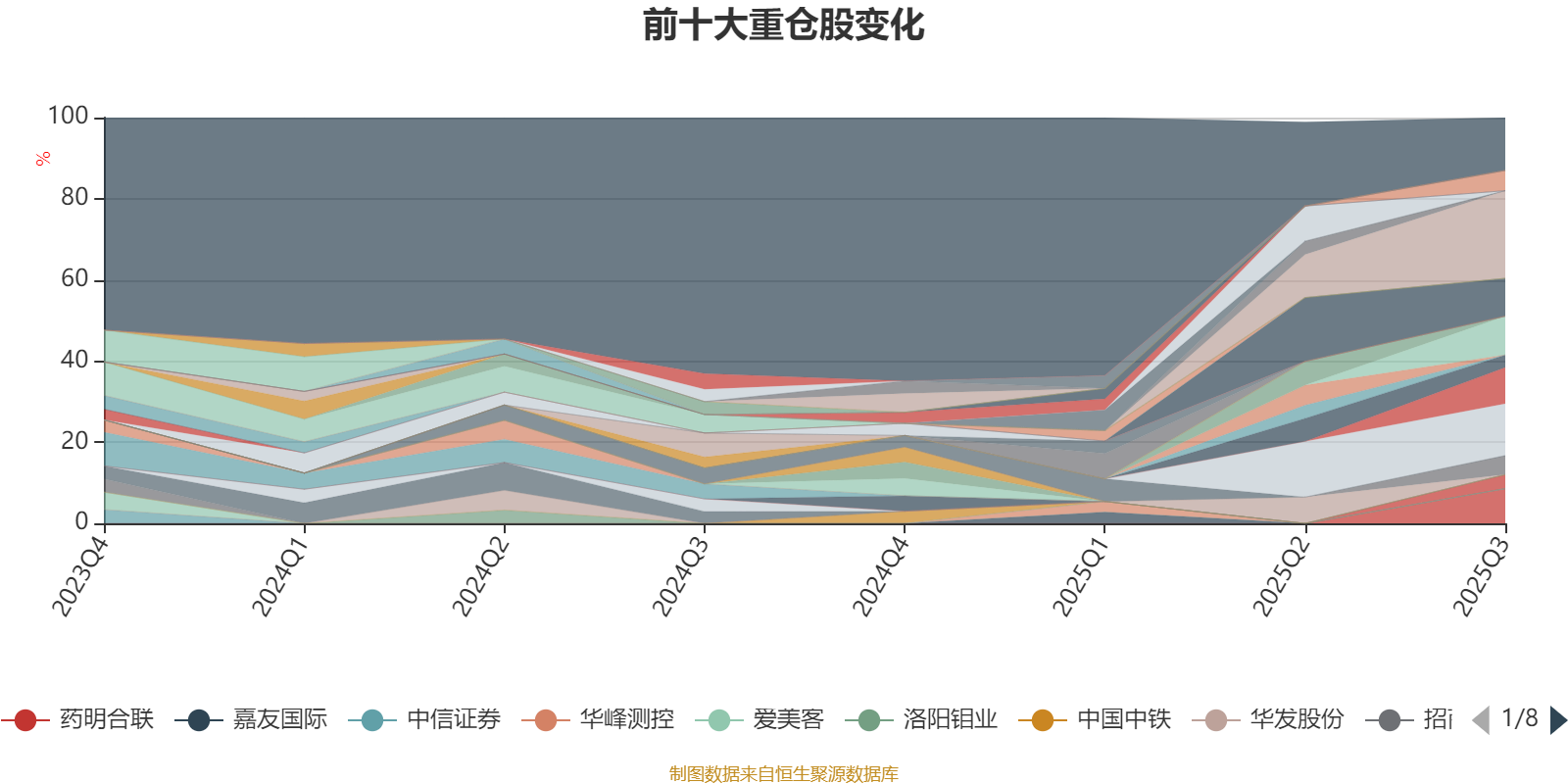 截至2025年三季度末,基金十大重仓股分别是恒瑞医药、工商银行、寒武纪、信达生物、三生制药、药明合联、三生国健、人福医药、南微医学、艾力斯。