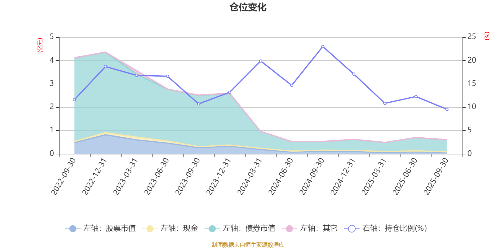 据定期报告数据统计,近三年平均股票仓位为15.29%,同类平均为19.14%。2024年三季度末基金达到23%的最高仓位,2025年三季度末最低,为9.55%。