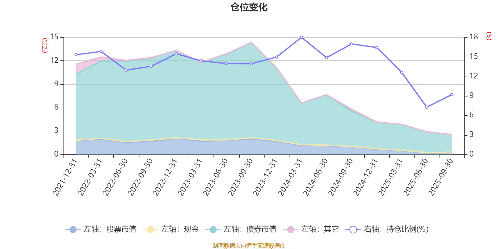 据定期报告数据统计,近三年平均股票仓位为14.02%,同类平均为19.14%。2024年一季度末基金达到18%的最高仓位,2025年上半年末最低,为7.28%。