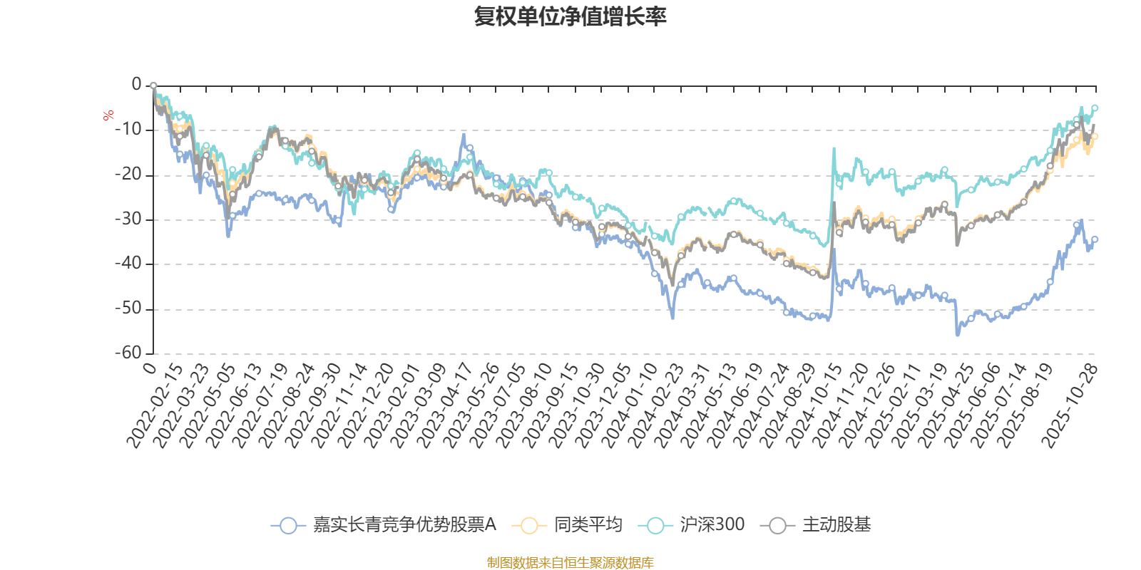 截至10月28日,嘉实长青竞争优势股票A近三个月复权单位净值增长率为24.37%,位于同类可比基金22/121;近半年复权单位净值增长率为37.54%,位于同类可比基金37/121;近一年复权单位净值增长率为16.80%,位于同类可比基金76/115;近三年复权单位净值增长率为-15.86%,位于同类可比基金82/87。
