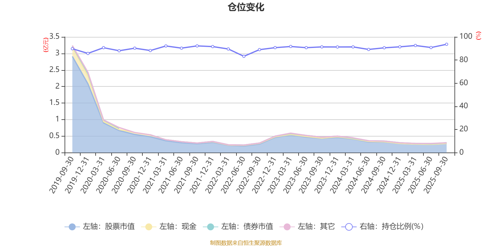 据定期报告数据统计,近三年平均股票仓位为91.29%,同类平均为88.23%。2025年三季度末基金达到93.64%的最高仓位,2022年上半年末最低,为83.23%。