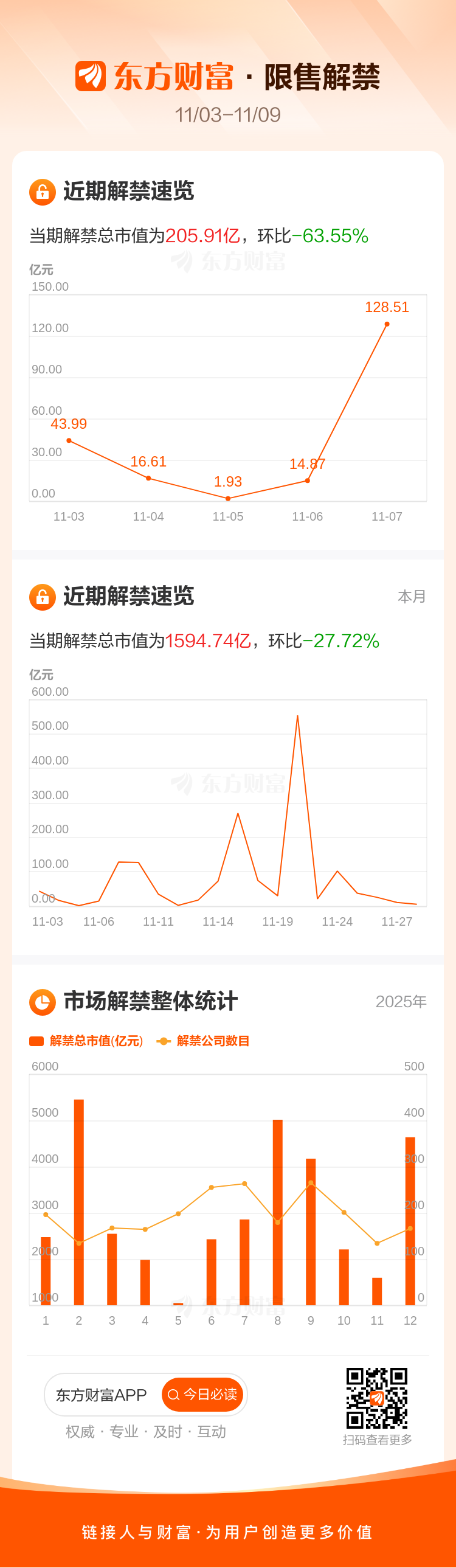 下周(11月3日至11月9日)有39家公司限售股陆续解禁,当期解禁总市值为205.91亿元,环比-63.55%。