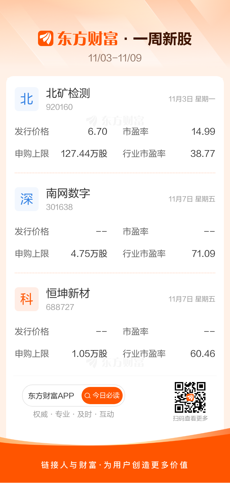 下周(11月3日至11月9日)沪深北三市有3只新股申购,分别为北矿检测、南网数字、恒坤新材。