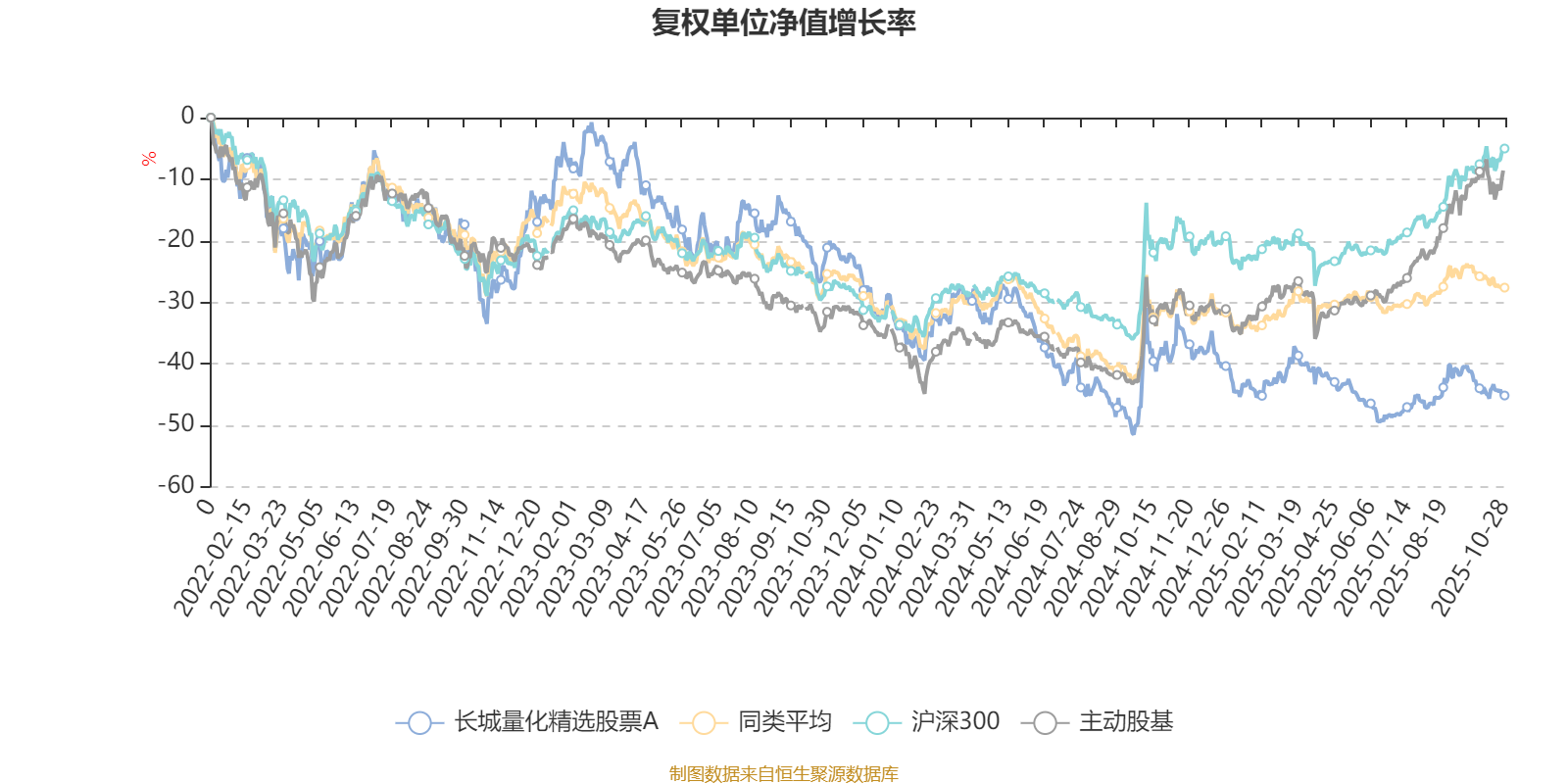截至10月28日,长城量化精选股票A近三个月复权单位净值增长率为1.71%,位于同类可比基金24/43;近半年复权单位净值增长率为-3.52%,位于同类可比基金41/43;近一年复权单位净值增长率为-13.93%,位于同类可比基金42/43;近三年复权单位净值增长率为-18.64%,位于同类可比基金38/40。