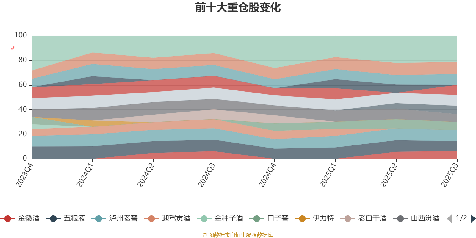 该基金持股集中度较高,且持股标的较为稳定,近2年前十大重仓股集中度长期超过60%。截至2025年三季度末,基金十大重仓股分别是贵州茅台、泸州老窖、古井贡酒、今世缘、洋河股份、五粮液、舍得酒业、口子窖、山西汾酒、金徽酒。