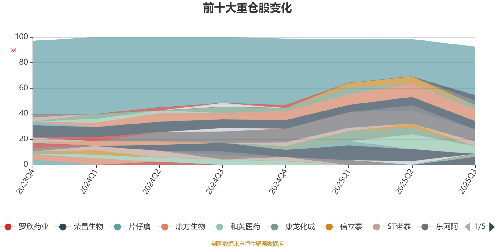 截至2025年三季度末,基金十大重仓股分别是科伦博泰生物-B、信达生物、百利天恒、荣昌生物、三生制药、汇宇制药、药明康德、恒瑞医药、同源康医药-B、康龙化成。