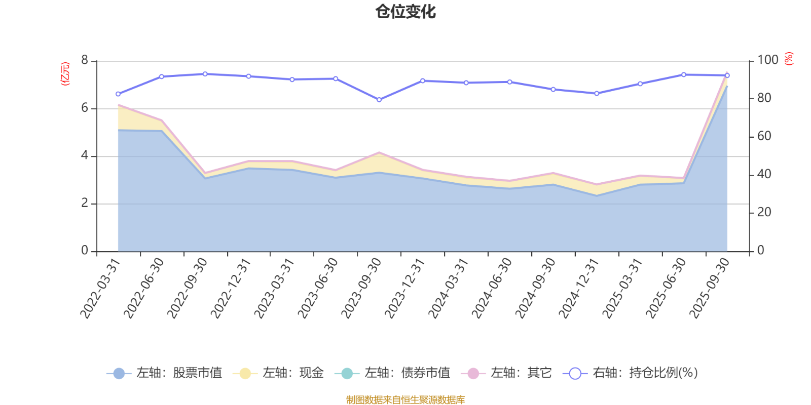 据定期报告数据统计,近三年平均股票仓位为88.31%,同类平均为86.94%。2022年三季度末基金达到93.08%的最高仓位,2023年三季度末最低,为79.56%。