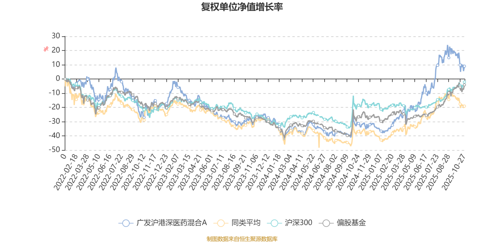 截至10月27日,广发沪港深医药混合A近三个月复权单位净值增长率为0.16%,位于同类可比基金32/106;近半年复权单位净值增长率为36.86%,位于同类可比基金6/104;近一年复权单位净值增长率为57.17%,位于同类可比基金5/101;近三年复权单位净值增长率为41.77%,位于同类可比基金8/75。