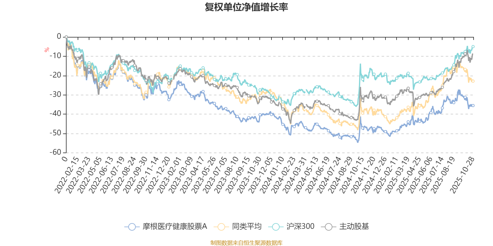 截至10月28日,摩根医疗健康股票A近三个月复权单位净值增长率为-5.36%,位于同类可比基金26/57;近半年复权单位净值增长率为14.27%,位于同类可比基金48/57;近一年复权单位净值增长率为20.72%,位于同类可比基金29/55;近三年复权单位净值增长率为-8.94%,位于同类可比基金36/48。