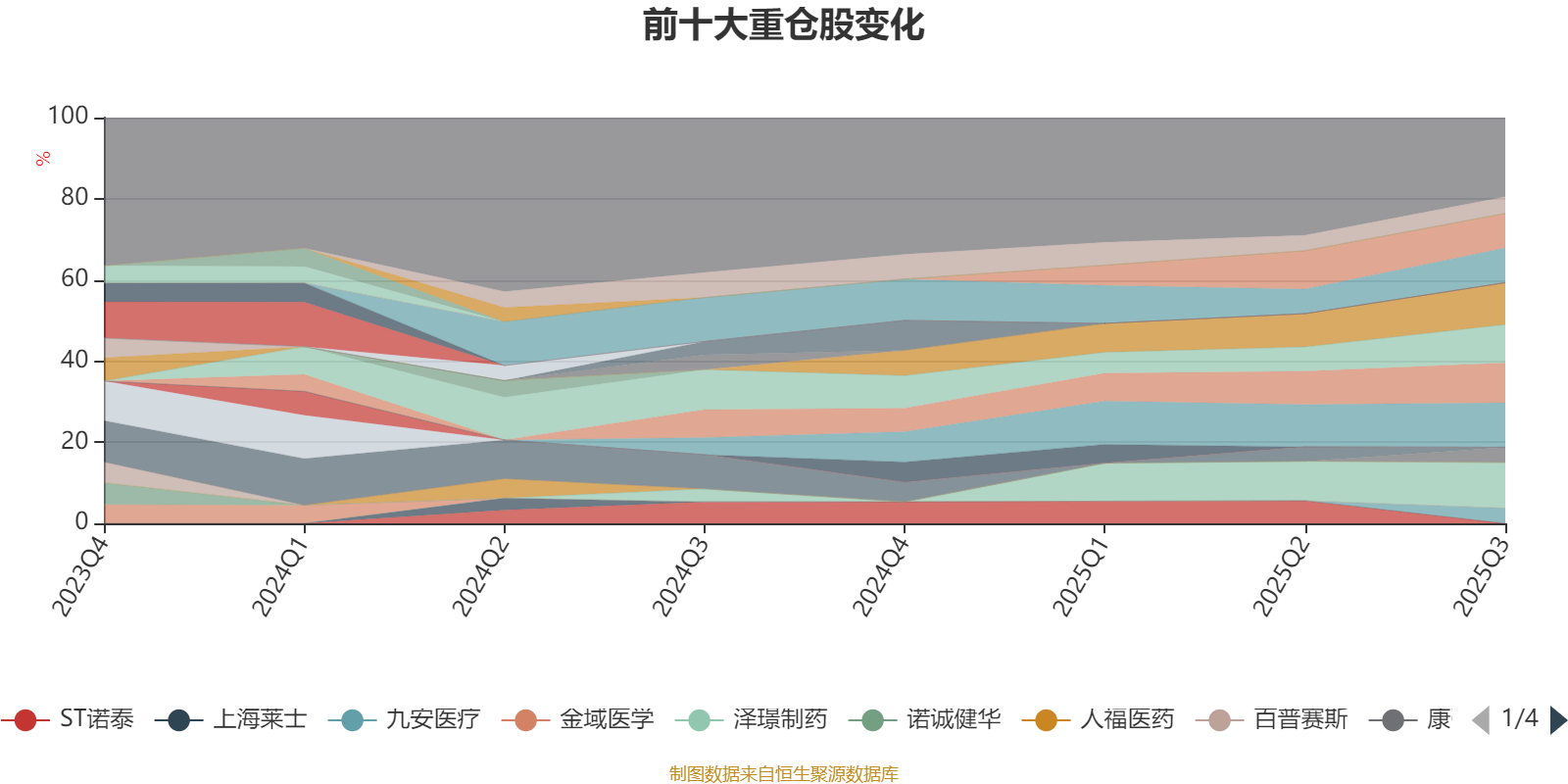 该基金持股集中度较高。截至2025年三季度末,基金十大重仓股分别是泽璟制药、艾力斯、药明康德、百济神州、科伦药业、恒瑞医药、益方生物、惠泰医疗、九安医疗、康弘药业。