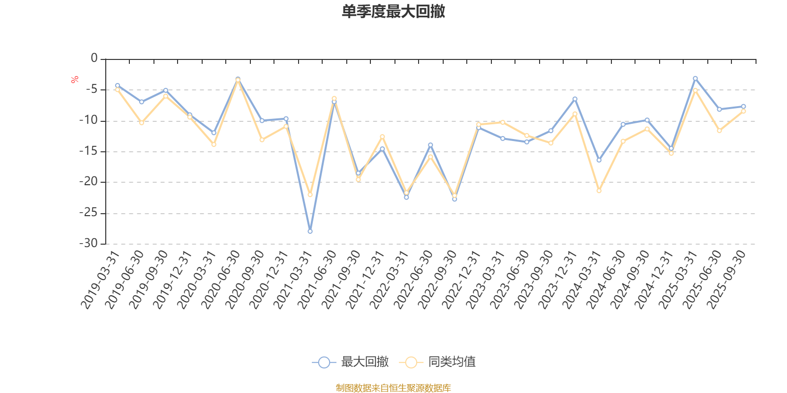 截至10月27日,基金近三年最大回撤为41.6%,同类可比基金排名28/48。单季度最大回撤出现在2021年一季度,为27.96%。